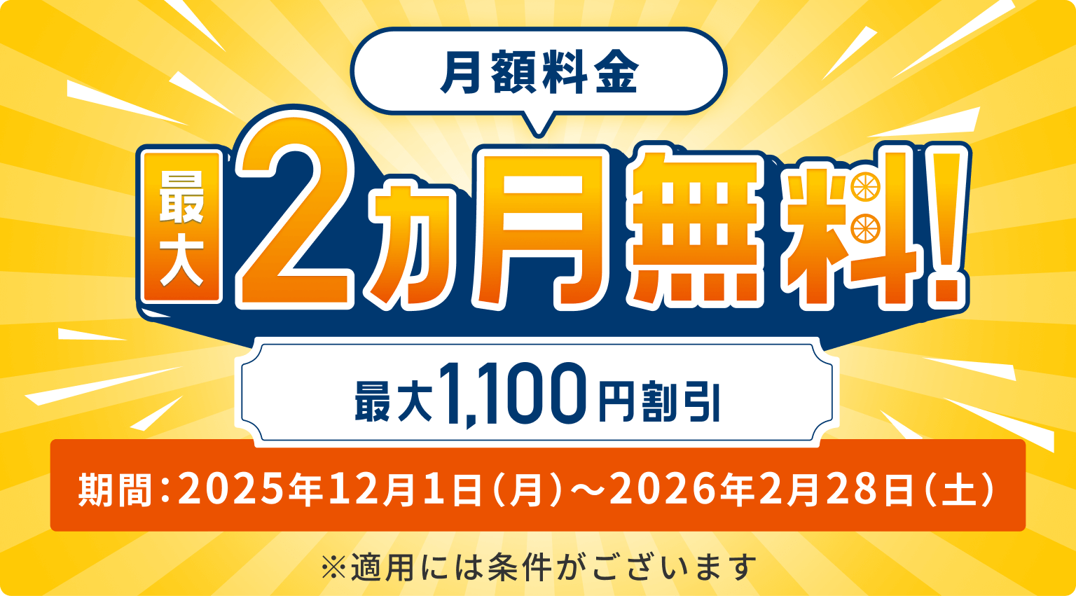 ※3月は対象期間外ですが、無料対象月になります(2月申込・入会でも3月含めて最大2ヵ月無料になります。2月28日お申込み・3月1日サービス開始の場合、3月のみ1ヵ月無料になります)